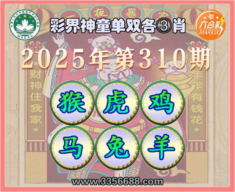 310期:《彩界神童》 🐁单双各③肖🐁【猴..鸡.马.兔.羊】开:虎16